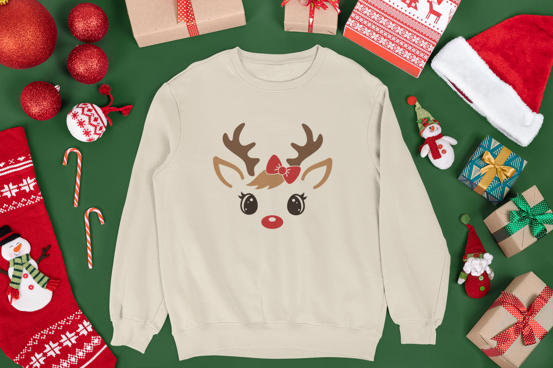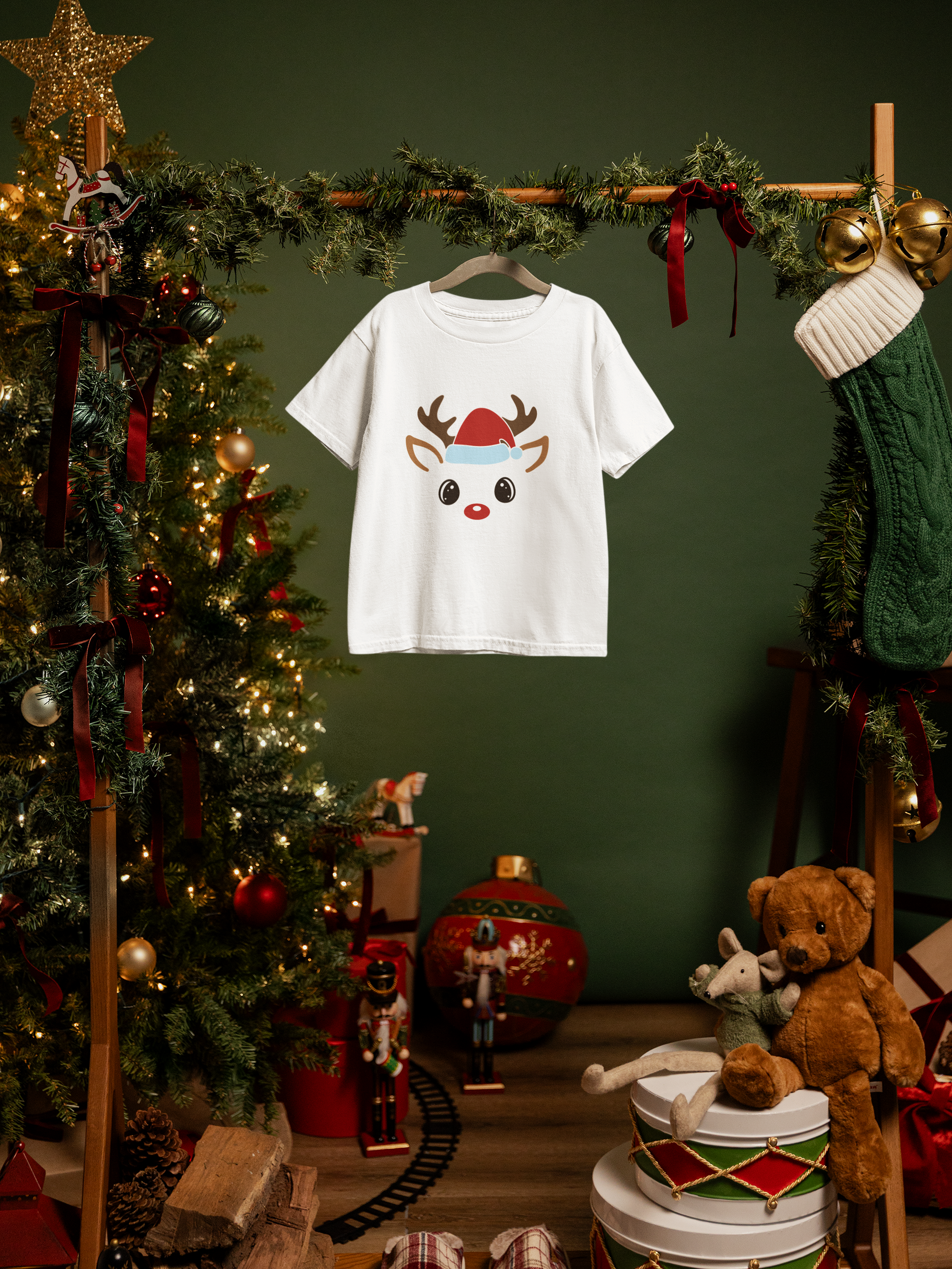 Créez l'ensemble familial parfait pour les fêtes! Chaque membre de la famille peut avoir son propre renne adorable avec son titre personnalisé. Le renne garçon porte une tuque festive tandis que la fille arbore une jolie boucle rouge. Idéal pour les photos de famille!