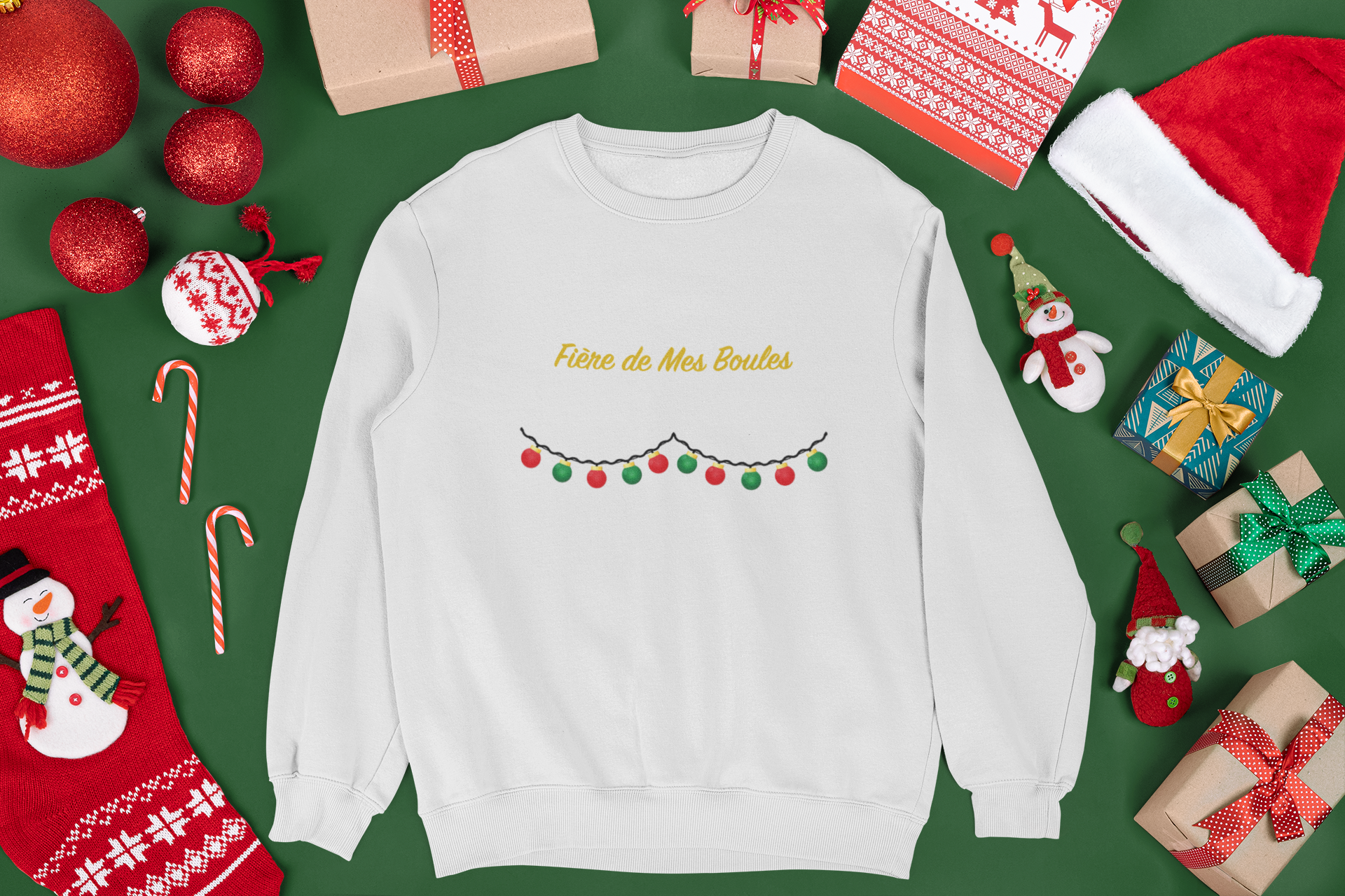 Un message audacieux avec une touche d'humour bien québécois! Ce chandail arbore fièrement des boules de Noël colorées sous un texte doré élégant. Pour les femmes qui assument leur côté festif avec un brin d'espièglerie!