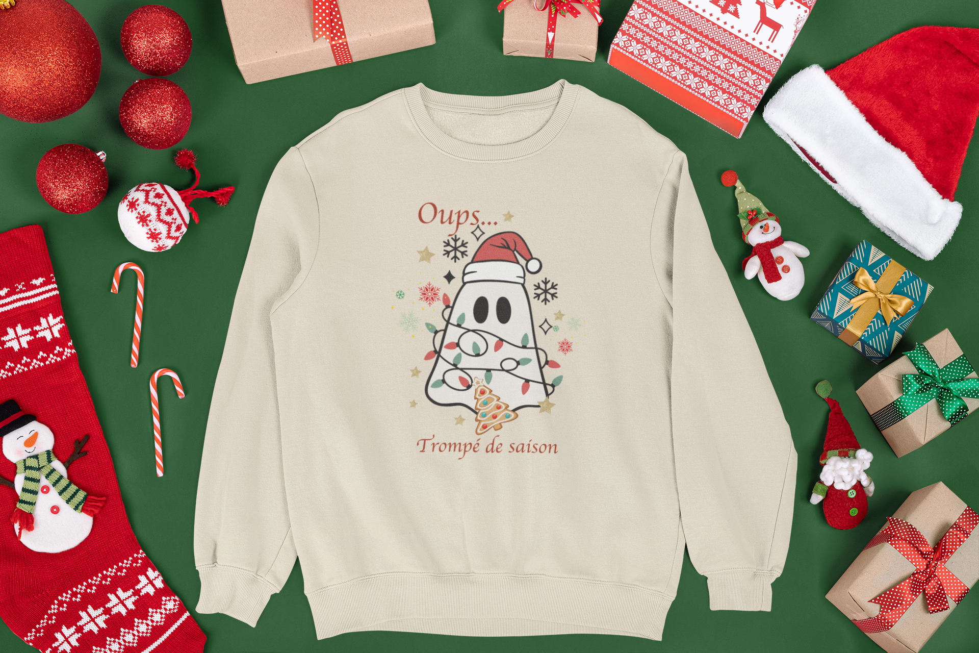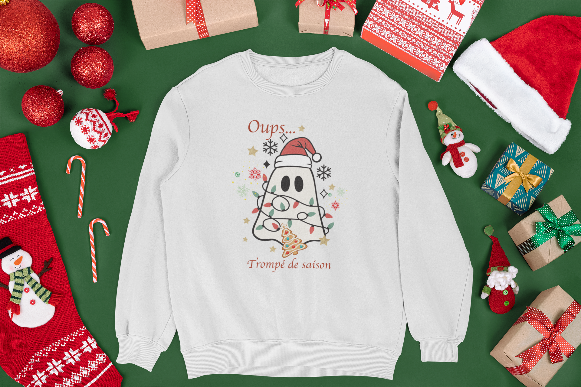 Ce petit fantôme d'Halloween s'est trompé de fête... mais il s'adapte avec style! Enroulé dans des lumières de Noël et coiffé d'une tuque du Père Noël, il prouve que c'est jamais trop tard pour célébrer. Un design humoristique et original!